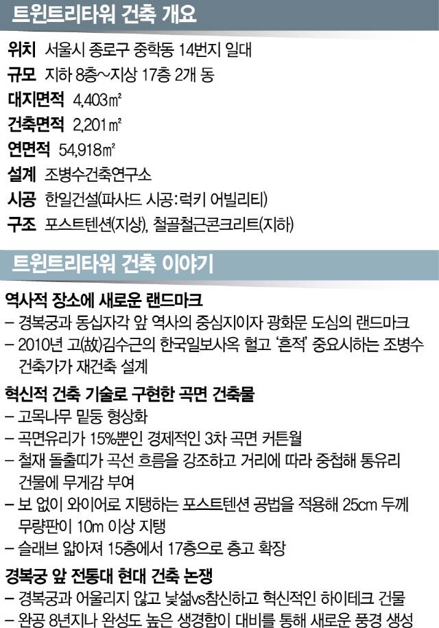 [서울경제] 경복궁 근정전에서 뒤를 돌아 왼쪽을 보면 행각 기와지붕 너머로 주름진 건축물 두 동이 눈에 띈다. 경복궁의 강한 상징성에 배경 정도로 전락할 법하건만 이 건물은 맞서 자기 색깔을 낸다. 가까이 다가갈수록 존재감이 더 커진다. 유리로 물결치는 투명한 건물은 수평띠의 밀도가 높아지며 그야말로 무게감 있는 덩어리가 된다. 3차원 곡면인 외형은 울퉁불퉁하게 홈이 파인 고목의 밑동을 닮았다. 형태 그대로 건물 이름이 ‘트윈트리타워’다. 지난 2010년 이후 이 생경한 건물은 경복궁과 묘한 공존 중이다. 대비를 통해 존재감이 선명해질수록 일대에 새로운 풍경이 만들어진다.