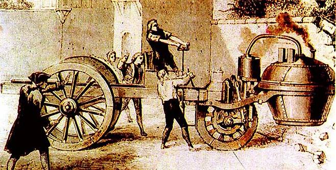 때는 1767년 오스트리아 육군에는 니콜라 조제프 퀴노(Nicolas Joseoh Cugnot)라는 기술자가 공병대 기사로 벨지움에 파견되어 근무하고 있었다. 퀴노는 영국인 제임스 와트가 발명한 증기엔진이 공장 동력용으로 많이 팔리고 있다는 소리를 듣고 영국의 공장으로 찾아가 구경한 다음 큰 감명을 받았다. 그는 이 엔진을 이용하여 그의 자동마차 만들기의 꿈을 실현하기위해 상세히 살핀 후 돌아와서 연구에 몰두한다. 2년간의 연구 끝에 드디어 설계도를 완성했다.