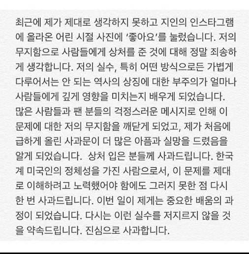 이어 "많은 사람들과 팬 분들의 걱정스러운 메시지로 인해 이 문제에 대한 저의 무지함을 깨닫게 되었고, 제가 처음에 급하게 올린 사과문이 더 많은 아픔과 실망을 드렸음을 알게 되었습니다"라고 덧붙인 그는 "상처 입은 분들께 사과드립니다. 한국계 미국인의 정체성을 가진 사람으로서, 이 문제를 제대로 이해하려고 노력했어야 함에도 그러지 못한 점 다시 한번 사과드립니다. 이번 일이 제게는 중요한 배움의 과정이 되었습니다. 다시는 이런 실수를 저지르지 않을 것을 약속 드립니다. 진심으로 사과합니다"라고 재차 사과의 뜻을 밝혔다.