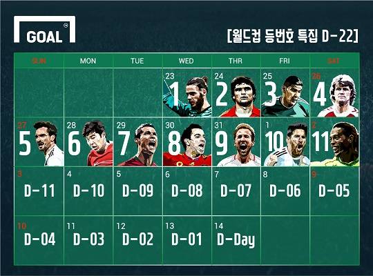 [골닷컴] 김현민 기자 = 이제 2018 러시아 월드컵 개막까지 12일 남았다. 세계인의 축구 네트워크 골닷컴은 월드컵 디데이에 맞춰 과거 해당 번호를 대표했던 전설과 이번 월드컵에서 이를 계승할 후계자에 대해 소개하도록 하겠다(번호는 디데이의 역순).
