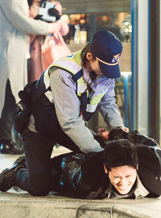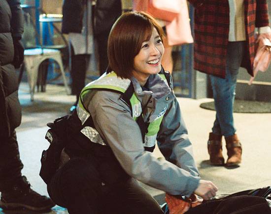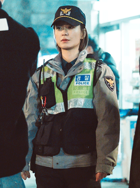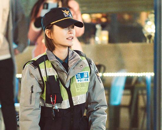 사랑스런 신입 경찰이었다. 정유미는 풋풋한 단발에 경찰 모자를 눌러썼다. 지구대 점퍼에 무전기도 착용했다. 잔뜩 긴장한 자세로 신입 느낌을 냈다.