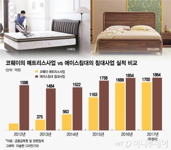 #국내 침대업계가 신흥강자의 출현으로 요동친다. 눈길을 끄는 건 판을 뒤흔든 신흥강자가 전문 침대업체가 아닌 생활가전업체 코웨이라는 점이다. 2011년 침대매트리스사업을 시작한 코웨이는 불과 5년 만인 2016년 매출액 1689억원을 올리며 침대업계 2위 시몬스의 전체 매출액(1541억원)을 넘어섰다. 지난해에는 해당 사업에서 약 1700억원을 벌어들이며 업계 선두기업 에이스침대의 침대사업 매출액(1864억원)을 바짝 좇았다.