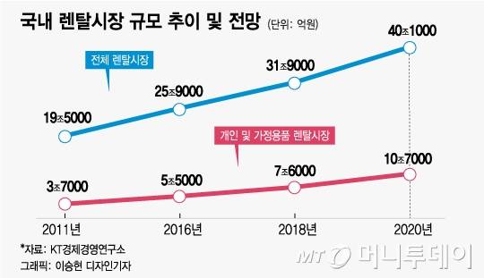 이에 국내 렌탈시장 규모는 2020년까지 40조원 규모로 급성장할 것이란 전망이 나온다. 16일 KT경제경영연구소 보고서에 따르면 국내 렌탈시장 규모는 2011년 19조5000억원에서 2016년 25조9000억원으로 48.6% 증가했고 2020년에는 40조1000억원까지 늘어날 것으로 추산됐다.