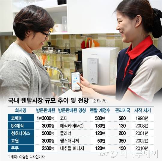 실제로 각사의 방판조직 규모는 회사 실적의 ‘바로미터’인 렌탈계정수로 이어진다. 1만3000명의 방판조직을 운영하는 코웨이는 약 580만개의 렌탈계정을 확보해 렌탈업계 1위를 유지한다. 이는 렌탈업계 2위권을 형성한 SK매직(130만계정)과 청호나이스(120만계정) 쿠쿠(120만계정) 교원(50만계정) 등의 렌탈계정수를 합한 것보다 많다.