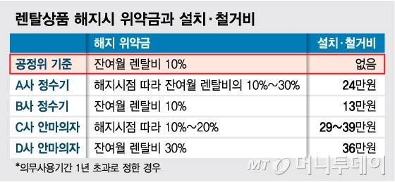 실제 LG전자의 정수기는 해지위약금이 사용기간에 따라 1년 미만은 잔여 렌탈료의 30%, 2년 미만은 20%, 3년 미만은 10%다. 설치비와 철거비도 내야 한다. 코웨이나 SK매직의 정수기는 위약금이 잔여 렌탈료의 10%로 공정위 기준을 준수하지만 10만원 넘는 설치비와 철거비를 받는다.