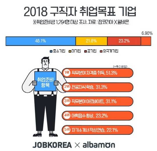 취업포털 잡코리아가 1월 18일부터 22일까지 알바몬과 함께 취업준비생 1,294명을 대상으로 '2018 취업준비 계획'을 조사한 결과, 취업준비생들은 이전과 다른 모습이었다.