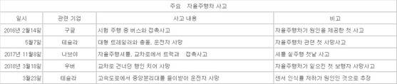 ![구조차량이 촬영한 지난해 9월 테슬라 자동주행(오토파일럿 모드) 차량의 중앙분리대 충돌사고 현장. 지난달 사망 사고처럼 오전 역광이 내리쬐는 상황에서 발생했다. 2016년 발생한 트레일러 충돌사고도 역광이 원인이었다.[미 ABC 방송 캡처]](https://img2.daumcdn.net/thumb/R658x0.q70/?fname=https://t1.daumcdn.net/news/201804/09/joongang/20180409173618067phvc.jpg)