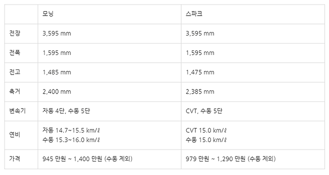 엔진을 비교해보면 두 차량 모두 3기통 1000cc의 엔진을 사용하고 있다. 하지만 변속기의 경우 모닝은 자동 4단 변속기, 스파크는 CVT를 적용했다는 점이 다르다. 엔진의 출력과 토크는 별 차이가 나지 않는다.