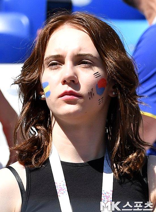 미녀 관중, 태극기와 스웨덴 국기 볼에 새기고 [MK포토]