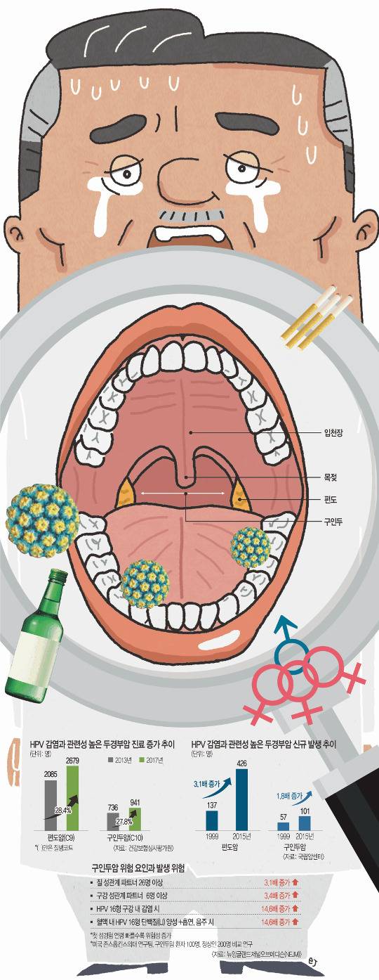 다만 HPV 감염과 관련성 높은 것으로 알려진 두경부암의 유형이 늘고 있음은 통계로 확인된다. 2015년 기준 신규 발생 편도암은 426명으로 1999년(137명) 보다 3.1배, 구인두암은 1.8배(57→101명) 증가했다. 건강보험심사평가원 자료를 보면 지난해 편도암 진료 환자는 2679명으로 2013년(2085명)보다 28.4% 늘었다. 구인두암은 27.8%(736명→941명) 증가했다. 정유석 전문의는 “국내 구인두암 발생률을 자체 조사해 봤더니 1999∼2014년 매년 3.2%씩 늘었는데 많은 전문가들이 그 원인을 HPV의 전파로 보고 있다”고 말했다.