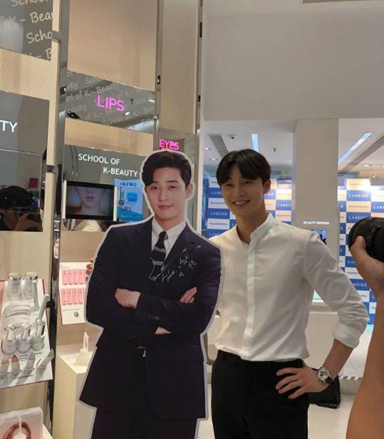 사진 속 박서준은 자신을 본떠서 만든 실물 크기의 판넬 옆에서 미소를 짓고 있다. 훈훈한 비주얼이 시선을 사로잡는다.