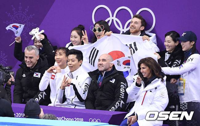 [OSEN=강릉, 민경훈 기자] 피겨 페어 감강찬-김규은이 9일 오전 강원도 강릉아이스아레나에서 진행된 '2018 평창동계올림픽' 피겨 스케이팅 팀이벤트 페어 쇼트 프로그램에 출전해 연기를 펼친 후 피겨 대표팀 선수들과 기뻐하고 있다.