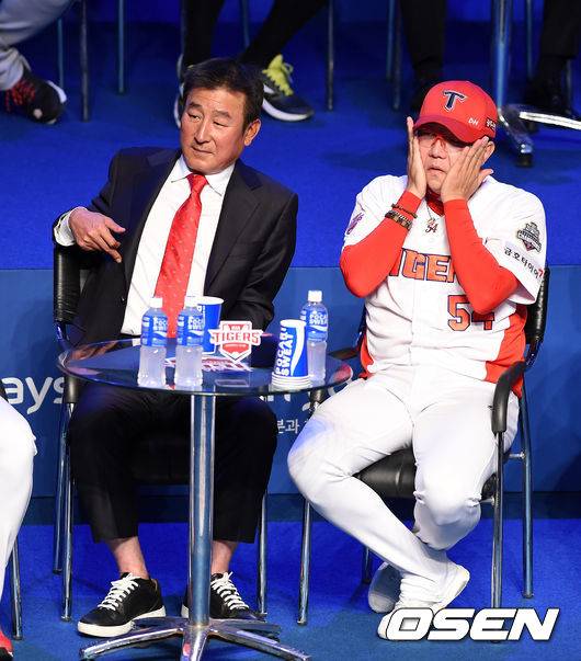 [OSEN=지형준 기자] 22일 오후 서울 한남동 블루스퀘어에서 열린 2018 신한은행 MYCAR KBO리그 미디어데이&팬페스트에서 KIA 양현종이 지난 시즌 우승 공약으로 내세운 댄스 영상을 보며 민망한 표정을 짓고 있다. /jpnews@osen.co.kr
