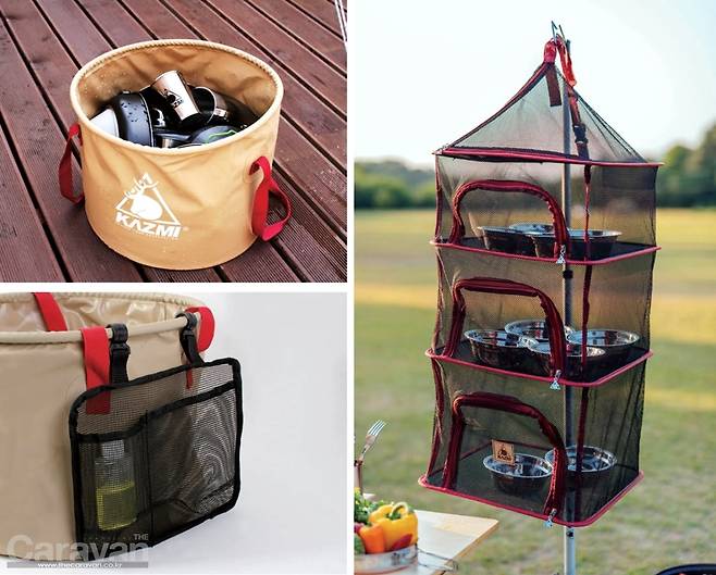 그냥 맛있는 음식을 먹는 것만으로 행복을 느끼기도 하는데, 카즈미 캠핑 씽크볼과 사각식기 건조망은 여기에 기분 좋은 개운함을 더 해줄 아이템이다. 27L 대용량 원형 디자인에 고강력 타포린 원단을 사용한 캠핑 씽크볼은 우수한 내구성과 방수 기능을 자랑하는 아이템이다. 넉넉한 사이즈로 설거지뿐 아니라 세탁이나 세탁물 보관도 가능하고, 더운 여름에는 대용량 물통이나 얼음을 넣어 음료와 과일을 차갑게 유지하는 냉장고가 되어주는 등 만능으로 활용성이 높다. 한눈에 들어오는 심플한 색상과 구성으로 옆면에는 물빠짐이 좋은 메쉬 소재의 포켓을 달아 세제통이나 수세미, 고무장갑을손쉽게 넣었다가 빼서 쓸 수 있게 실용성을 더했다.
