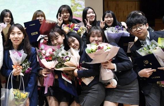 8일 서울 영등포구 양화중학교에서 열린 졸업식에서 학생들이 졸업을 축하하며 기념사진을 찍고 있다. 사진=박범준 기자