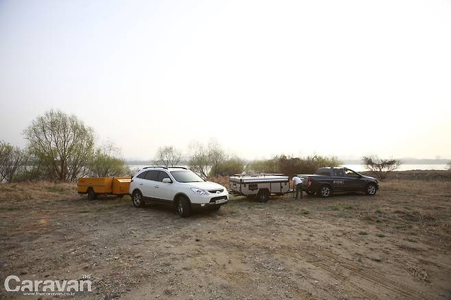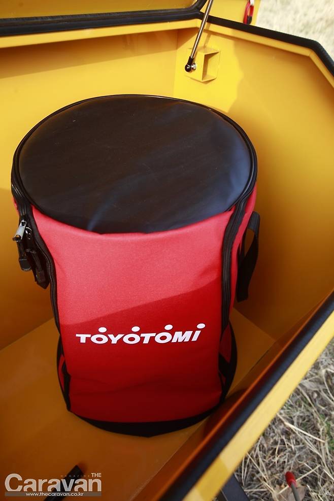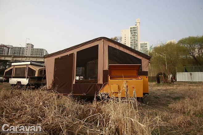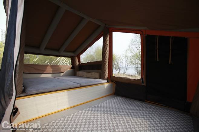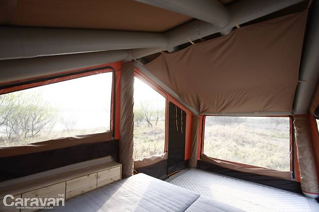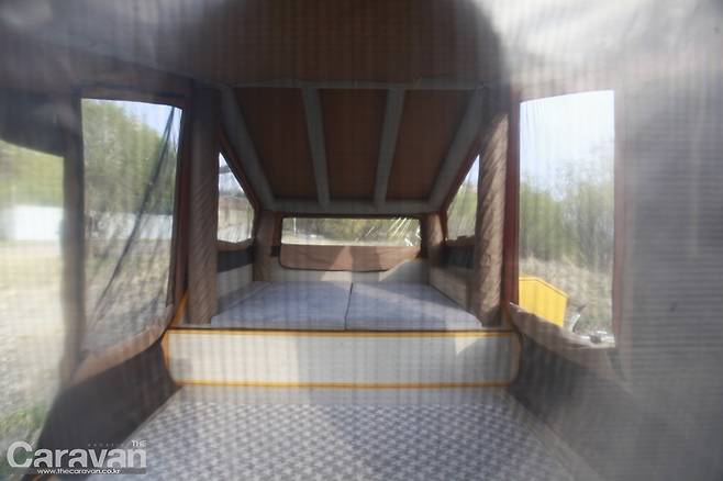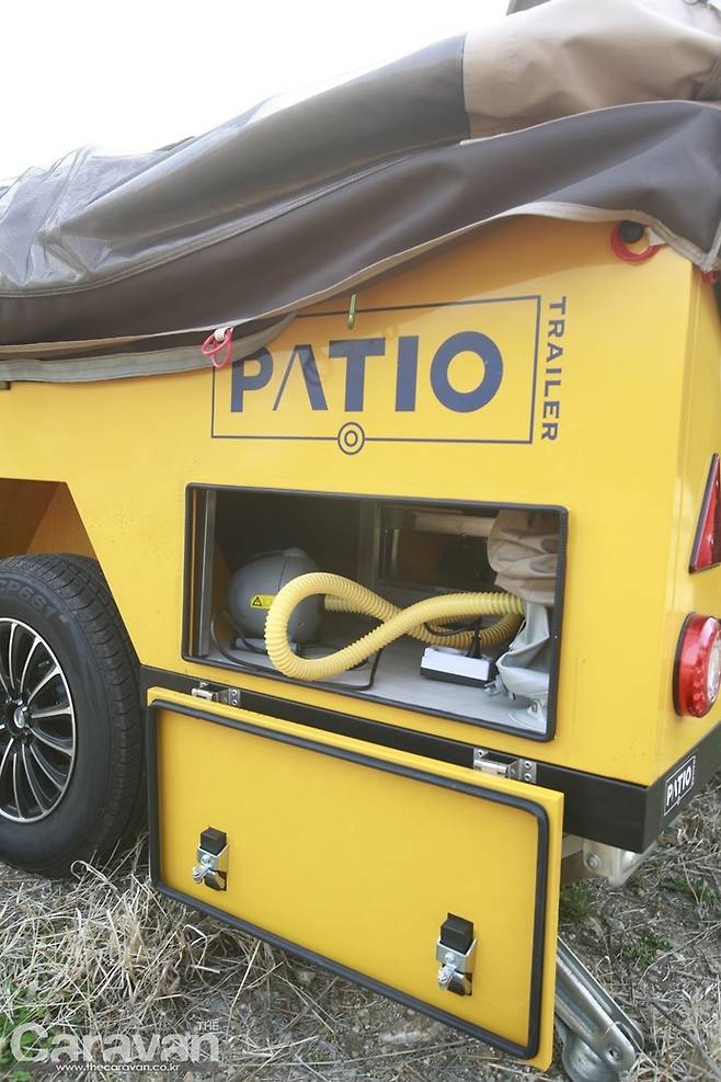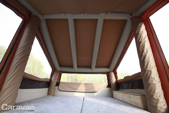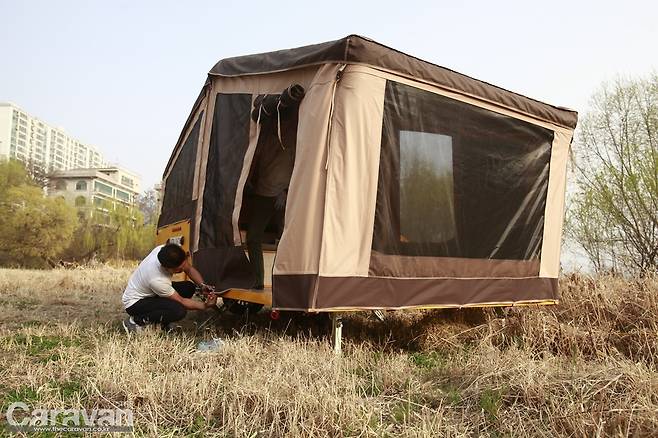 지금까지의 텐트 트레일러는 이제부터 많은 손길이 필요했다. 하지만 파티오 에어는 외부의 잠금 장치를 풀고 에어 펌프를 꼽아주면 반 이상의 작업이 끝났다고 볼 수 있다. 파티오 에어5는 정면을 기준으로 보면 좌측으로 열린다. 메인 출입구와 동선이 후면부임을 감안하여 쇼바의 탄성을 이용해 우측으로 힘차게 열어준다. 커버 하단에 있는 높이 조절 장치를 움직여 설치 후 바닥과 평행하게 바닥을 유지해 주면 편하다. 에어 펌프의 스위치를 켜자 1분 후에 에어 텐트가 제 모습을 갖춘다. 내부로 들어가 폴대를 펴고 정리해야 하는 과정 자체가 생략되었다.