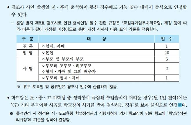 | ▲ 경조사로 인한 출석인정결석 일수와 여학생 생리통으로 인한 출석인정결석 내용 경조사로 인한 출석인정결석 일수는 주5일제수업이 전면 시행된 2012년이후 규정이 바뀌었고, 여학생 생리통으로 인한 출석인정결석관련 규정은 2006년부터 적용하고 있다. |