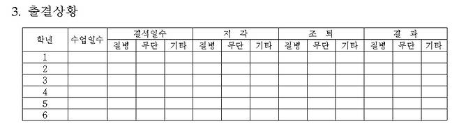 | ▲ 학교생활기록부 출결상황 기록 양식 결석만 질병, 무단, 기타로 세 칸을 나누어서 기록하는 게 아니라, 지각, 조퇴, 결과 역시 질병, 무단, 기타로 나누어서 기록하게 되어있다. |
