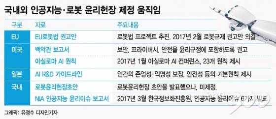 유럽연합(EU) 집행위원회는 지난해 2월 EU로봇법 권고안을 의결했다. 로봇개발과 관련한 규제를 담은 내용이다. 미국에서는 아실로마에서 열린 인공지능(AI) 컨퍼런스에서 개발자가 지켜야 할 원칙 23개를 마련했고, 일본에서도 AI R&D 가이드라인을 만들었다. 해당 가이드라인에는 인간의 존엄성과 익명성 보장, 안전성 등이 반영됐다.