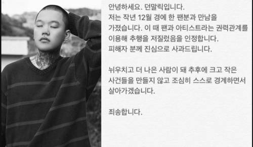 그 다음 날 던말릭에게 성폭행을 당했다는 글이 추가로 올라오자 던말릭은 자신의 SNS에 "팬과 아티스트라는 권력관계를 이용해 추행을 저질렀음을 인정한다. 피해자분께 진심으로 사과드린다"는 글을 올렸고 소속사는 그를 퇴출시켰다.