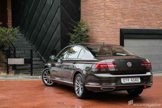변화 폭은 뒷모습도 크다. 이전 세대 파사트는 동생 격인 제타의 그것과 별반 다를 바 없는 테일램프 디자인에 크기만 키워 우스꽝스러운 모습을 보였다. 이번 8세대에서는 테일램프의 테두리 선을 날카롭게 정리했다. 번호판의 자리가 아래로 내려가 넓어진 공간에는 사이즈를 키운 ‘VW’ 엠블럼이 위치한다. 이 엠블럼은 위•아래로 회전해 트렁크를 여는 레버와 후방 카메라로 변신한다.