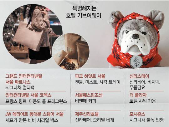 [서울경제] # 서울 서초동에 거주하는 주부 장 모(45) 씨는 방학을 맞아 초등학생 아이들과 함께 그랜드 인터컨티넨탈 서울 파르나스 ‘윈터 컬렉션 패키지’를 예약했다. 아이들과 즐거운 시간을 보내는 것 못지않게 호텔 측이 패키지 ‘기브어웨이(증정품)’로 준비한 ‘인터컨티넨탈 시그니처 멀티백’이 탐났기 때문이기도 하다. 이 멀티백은 노트북이 들어갈 정도의 넉넉하고 실용적인 사이즈로 자체 항균작용이 있고 보온성, 통기성, 흡수성이 뛰어난 주트(황마) 소재를 사용했다. 손잡이는 소가죽으로 제작했다. 장 씨는 “호텔에서 1박을 하려고 했는데 패키지 구성이나 숙박하려는 호텔 수준이 비슷하다면 선물 구성이 좋은 곳을 선택하는 것이 더 이득이 아니냐”며 “아울러 다른 데서는 구할 수 없는 한정판의 매력도 있다”고 말했다. 호텔들이 고객들을 끌어 들이기 위해 문턱을 낮추는 가운데 단순히 증정품으로만 여겨지던 ‘기브어웨이’가 차별화된 서비스를 펼치는 마케팅의 핵심 수단으로 떠오르고 있다. 기브어웨이는 호텔에서 패키지 제공용이나 VIP 선물용으로 호텔을 대표하는 로고를 박아 직접 제작하는 상품. 밖에서는 살 수 없기 때문에 한정판에 대한 매력으로 고객 충성도를 높일 수 있을 뿐 더러 만족도도 높다. 그랜드 인터컨티넨탈 파르나스 관계자는 “기브어웨이 하나만 봐도 호텔의 느낌이나 수준을 그대로 보여주기 때문에 이는 호텔의 자존심 싸움이기도 하다”며 “실제로 요즘에는 기브어웨이를 어떻게 구성 하냐에 따라 패키지 성공 여부가 갈릴 정도”라고 귀띔했다. 인터컨티넨탈 서울 코엑스도 유명 향수 제작업체와 손잡고 고객들이 최근 트렌드인 ‘휘게 라이프’를 경험할 수 있도록 프랑스산 향료와 고급 향수 베이스를 이용한 다용도 ‘홈 프레그런스(7만 원대)’를 제작해 패키지 고객에게 제공하고 있다. 몇 차례에 걸친 사전 시향을 통해 가장 대중적이면서도 편안하게 쉬기에 적합한 향(시트러스 자몽향·편백나무향)을 선정했다. JW 메리어트 동대문 스퀘어 서울도 지난해 말부터 바비와 콜라보한 딸기 디저트 뷔페 ‘살롱 드 딸기’를 운영하며 이용 고객에게 선착순으로 특별 제작한 ‘바비 시리얼 박스’를 선물로 제공하고 있다. 바비의 부티크 숍을 콘셉트로 한 핑크빛 디자인의 시리얼 박스에는 페이스트리 수석 셰프 채드 야마가타가 직접 개발한 레시피의 그래놀라 시리얼 디저트를 담았다. 서울 웨스틴조선호텔은 조선호텔의 100년 스토리를 담은 자체 브랜드 커피 ‘비벤떼 BtoB No.8’를 출시, 호텔 내 레스토랑의 시그니처 커피로 고객에게 선보이고 있다. 파크 하얏트 서울은 출장 시 휴대가 간편한 가죽 사각 트레이를 해외 비즈니스 고객을 겨냥해 제작했다. 또 시그니처 캔들과 패브릭 미스트도 만들었다. 포시즌스 호텔 서울은 최근 어린이 고객을 대상으로 겨울을 맞아 한정판 제작한 불독 인형을 선물로 만들었다. 겨울 한정판 어메니티는 포시즌스 호텔 서울의 시그니처 아이템인 불독 인형에 붉은 노르딕 무늬의 조끼를 입히고 포시즌스 로고가 박힌 팬던트 목걸이를 걸어 특별함을 더했다. 제주 신라호텔은 객실에 비치한 것과 같은 오리털 베개와 커버를 선착순으로 고객에게 제공하고 있다. 신라호텔의 오리털 베개는 호텔측이 최적의 수면환경을 구현하기 위해 오리 깃털과 가슴털을 알맞게 혼합해 자체 주문 제작한 것으로 고객들이 별도의 구입을 문의할 정도가 인기가 높은 아이템이다. /심희정기자 yvette@sedaily.com