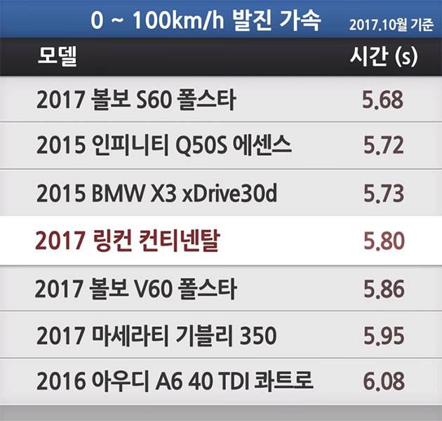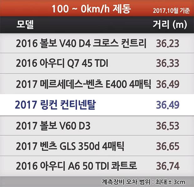 컨티넨탈의 제동 능력도 확인했다. 시속 100km에서 완전히 이동하는데 이동한 거리는 36.49m였다. 이는 최단 거리이며, 평균적으로 37m 대를 꾸준하게 유지했다. 의외라고 할 정도로 제동 성능이 좋았다. 차량이 완전히 멈출 때 소폭 밀리는 감도 있었기 때문이다. 아무래도 무게가 나가는 대형 세단이라는 점을 이해해야 한다. 실제 무게를 측정한 결과 2,113kg에 이르는 몸무게를 보였다. 사실 무겁다. 하지만 컨티넨탈은 아무렇지도 않다는 듯 테스트 마지막까지 36~37m 대의 제동거리를 기록해냈다. 한두 번 성능을 내는 것은 어렵지 않지만 수차례 성능을 이어간다는 것이 더 중요하다. 제동력은 사람이 판단하기 어려운 영역이다. 체감적으로 많이 밀리는 듯한데 의외로 짧은 거리에 제동되는 차들도 많다. 컨티넨탈도 체감적으로는 40m 내외를 기록할 듯했지만 좋은 성능을 보였던 것.