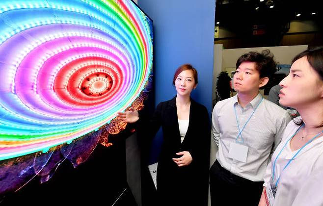 관람객이 루멘스가 만든 차세대 '70인치 마이크로 LED 디스플레이'를 구경하고 있다.
