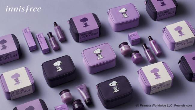 이니스프리도 새해를 맞아 한란 제품을 담은 ‘한란X스누피 콜라보 럭키박스’(사진 왼쪽)를 내놓았다. 한정 수량으로 선보인 한란X스누피 럭키박스는 한란 인리치드ㆍ인텐스 크림 구매시 한란 스킨케어 본제품 1종(랜덤)을 추가로 증정하는 구성이다.