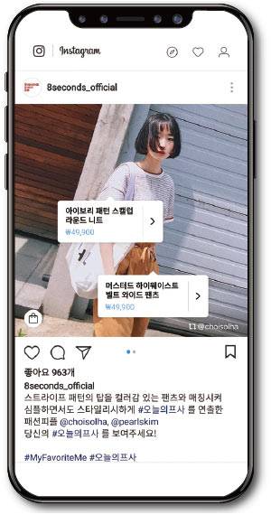 인스타그램이 지난달 31일 국내에 쇼핑 기능을 도입했다. 이 기능을 활용한 에잇세컨즈의 인스타그램 화면. 사진 에잇세컨즈 인스타그램