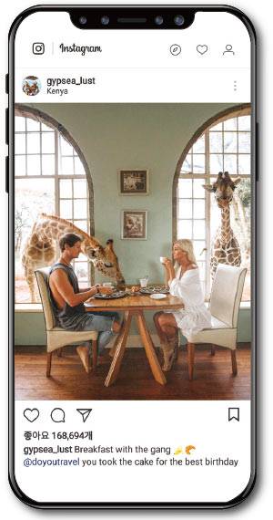 양 대표는 협찬을 받아 세계를 돌아다니며 인스타그램에 사진을 올리는 부부의 이야기를 꺼냈다. 이 부부는 지난해 인스타그램에서 화제가 된 사진을 찍었다. 아침을 먹고 있는데 열린 창문으로 기린이 고개를 쑥 들이밀어 같이 밥을 먹는 사진이다. 이곳은 아프리카 케냐에 위치한 ‘기린 장원 호텔(The Giraffe Manor)’이다.