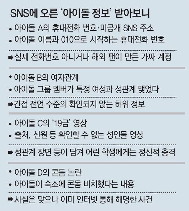 아이돌을 숭배하는 10대 ‘팬심(Fan+心)’을 겨냥해 SNS에서 아이돌의 개인정보를 불법 유통하는 일이 늘고 있다. 정보라고는 하지만 대부분 확인되지 않는 험담이거나 명예훼손을 범할 수도 있어 멋모르고 받아 유포하다가는 형사처벌 대상이 될 수 있다.