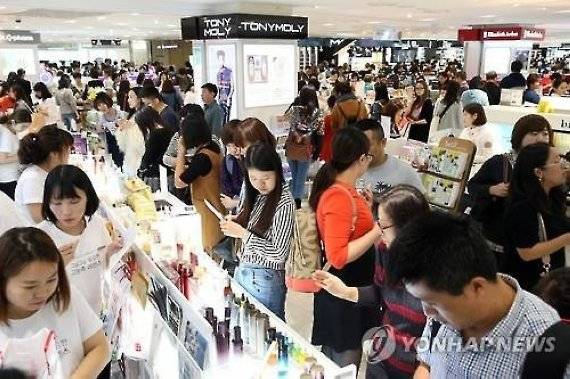 | 한국 화장품 면세 매장에 몰린 중국인들 (서울=연합뉴스) 지난해 국경절(10월 1~7일) 연휴를 맞아 대거 방한한 '유커'(遊客·중국인 관광객)들이 10월 4일 오후 서울 소공동 롯데백화점 면세점 화장품 코너에서 쇼핑을 즐기는 모습. <연합뉴스 자료사진> /사진=연합뉴스 |