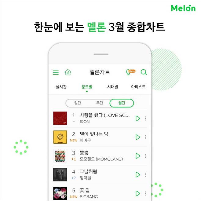 2월에 이어 iKON의 ‘사랑을 했다(LOVE SCENARIO)’가 3월에도 멜론 종합차트 정상에 올랐다. 또한 ‘믿듣맘무’로 통하는 마마무의 ‘별이 빛나는 밤’과 제목 그대로 꽃 길을 걷고 있는 BIGBANG의 ‘꽃 길’이 각각 2위와 5위로 새롭게 차트에 등장했다.