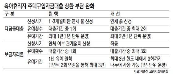 디딤돌대출을 받은 육아휴직자는 연체 여부와 상관없이 육아휴직 횟수에 따라 최대 2회, 총 2년 동안 원금상환을 유예받을 수 있게 된다. 저출산.고령사회위원회와 국토교통부, 금융위원회는 일하며 아이를 키우는 부모의 부담을 덜어주기 위해 이 같은 내용을 담은 제도개선을 추진한다고 27일 밝혔다. 디딤돌대출과 보금자리론은 무주택 신혼부부들이 주로 이용하는 저금리 정책자금 대출이다.
