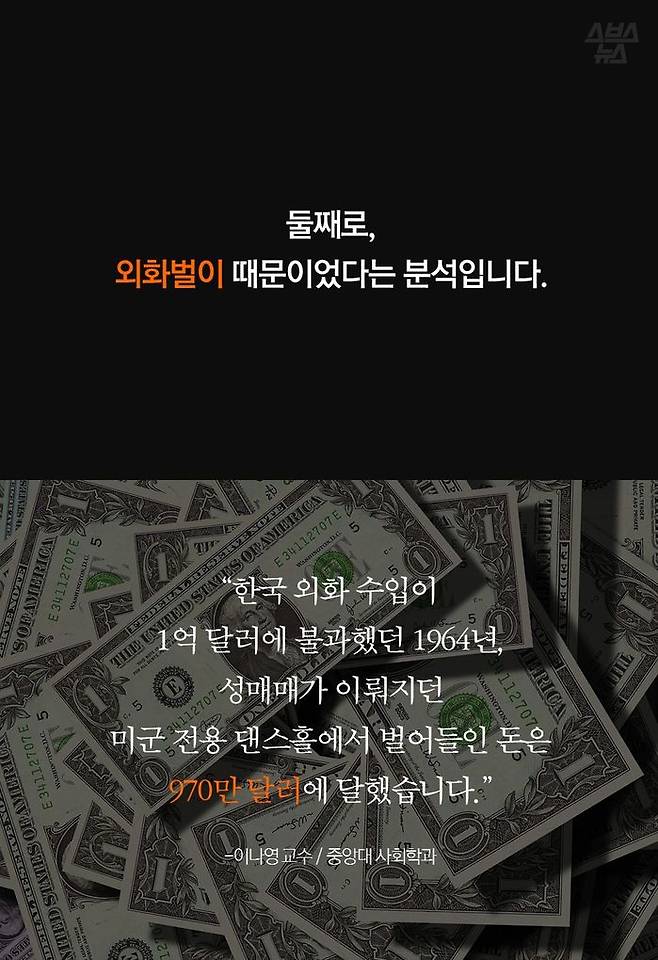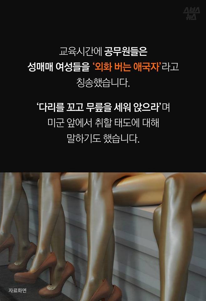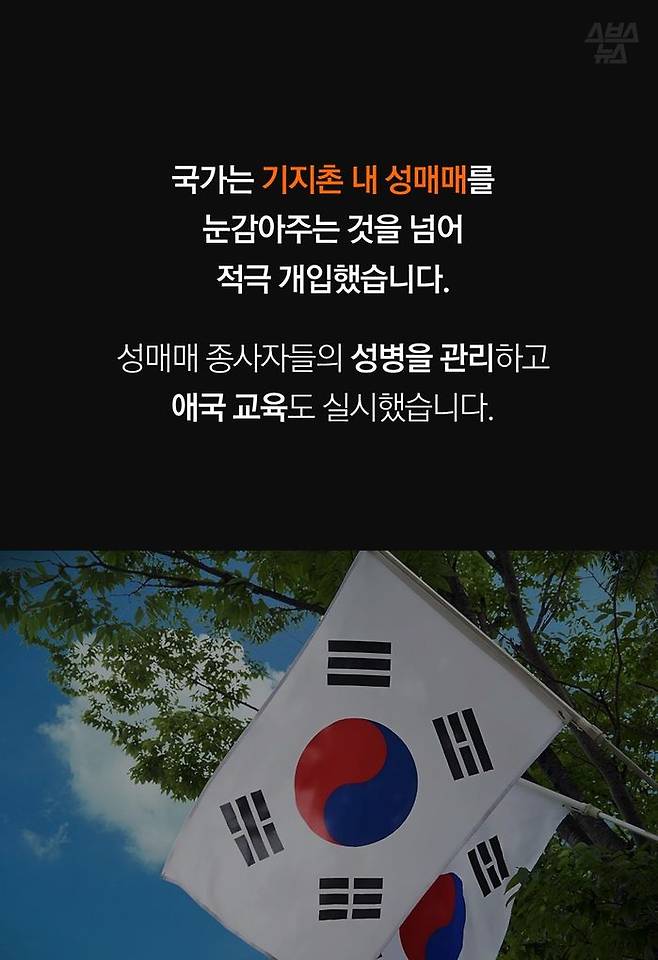 국가는 안보와 경제에 도움이 된다는 이유로 기지촌 내 성매매에 대해 적극 개입하기까지 했습니다. 국가는 기지촌 성매매 종사자들의 성병을 관리하고 애국 교육도 실시했습니다. 공무원들은 성매매 여성들을 '외화를 버는 애국자'라고 칭송하기도 했습니다.