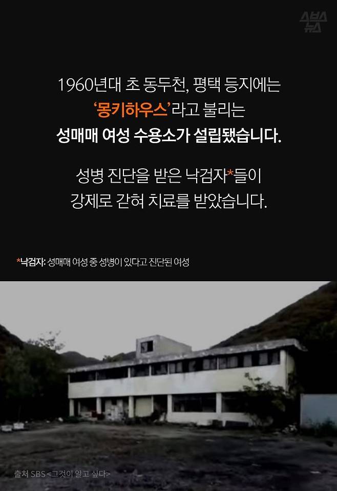 1960년대 초 동두천 등 경기도 곳곳에는 성매매 여성 수용소가 설립됐습니다. 성병 진단을 받은 여성들은 이 수용소에 강제로 갇혀 치료를 받았습니다. 이 수용소는 '몽키하우스'라고 불렸습니다. 여성들이 수용소 철장에 매달려 소리를 지르는 모습이 꼭 동물원 원숭이 같다고 해서 붙여진 이름입니다.