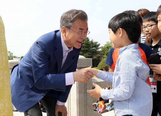 문 대통령 내외는 이후 청와대 대정원으로 내려가는 아이들과 모두 악수를 하는 등 인사를 나눴다.