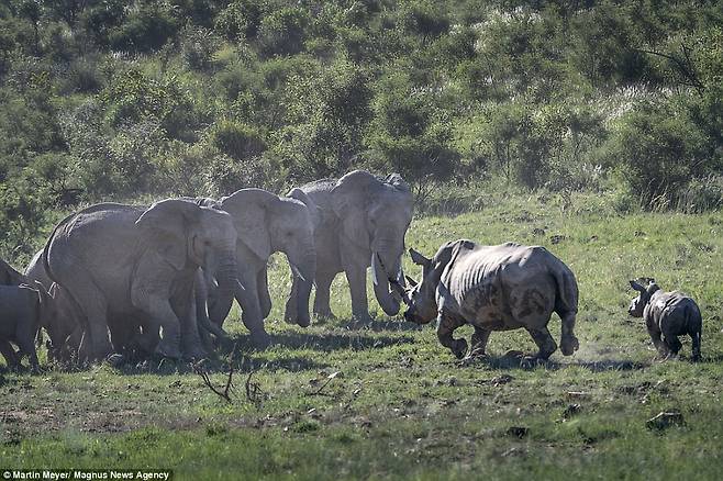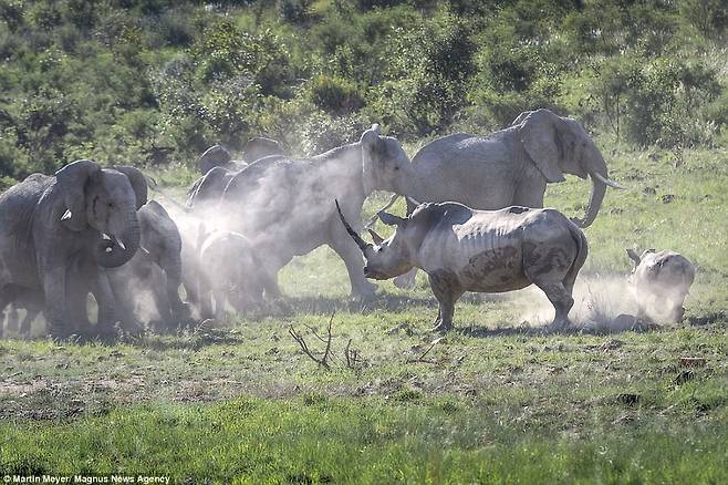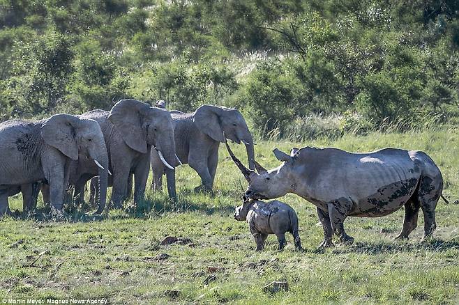 이에 대해 당시 상황을 모두 목격한 메이어는 “어미 코뿔소는 코끼리 무리가 약 20m 거리까지 접근하자 코끼리들을 향해 돌진했다”면서 “코끼리들은 처음에 당황했지만 곧 정신을 차리고 뭉쳐 대열을 이룬 뒤 조롱하듯 어미 코뿔소에게 천천히 다가갔다”고 설명했다.
