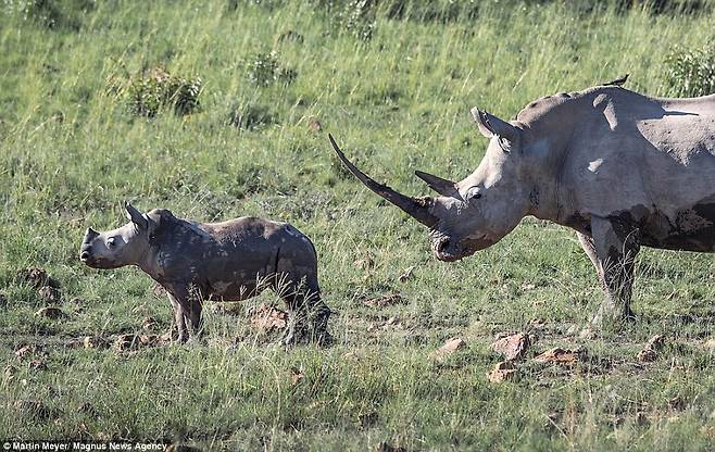 한편 사진 속 어미 코뿔소의 뿔이 얼마나 긴지는 알려지지 않았지만, 가장 긴 뿔은 1.5m가 넘는다는 기록도 있다. 암컷 코뿔소는 무게가 2t 정도 나가지만, 완전히 다 자란 암컷 코끼리의 무게는 3t에 달한다.
