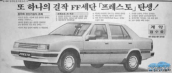 현대자동차에게 있어 상징적인 의미가 큰 포니. 그의 뒤를 이은 소형차 모델은 프레스토다. 프레스토는 1985년에 등장한 포니의 후속 차종, ‘포니엑셀(Pony Excel)’의 세단형 모델이다. 외관 디자인은 포니의 스타일링을 빚었던 주지아로에서 담당했고 설계적 기반은 미쓰비시의 초대 미라주(Mirage)의 전륜구동 플랫폼을 바탕으로 하고 있었다. 따라서 포니 엑셀과 프레스토는 대한민국 최초의 전륜구동 승용차이기도 하다.