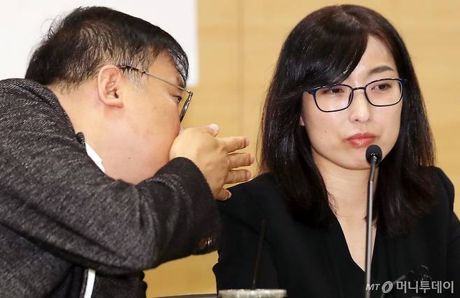 강원랜드 채용비리 수사외압을 제기한 김필성 변호사, 안미현 검사가 15일 오전 서울 서초구 변호사교육문화관에서 '강원랜드 수사외압 사건 수사에 관한 기자회견'을 연 가운데 귓엣말을 하고 있다.