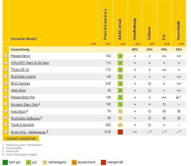 그보다는 유럽 최대 자동차 소유주 클럽인 아데아체(ADAC)가 2011년 발표한 자료를 스노 체인 구매에 기준으로 삼을 만 하다. 테스트 방식은 조립과 해체 그리고 포장과 작동 지침 등 사용성에 관한 것이 40%, 눈길 위 주행거동에 관한 것이 35%, 얼음 위 주행거동에 관한 것이 10%, 체인의 무게나 모양 등의 기하학적인 정보 등이 15%다.