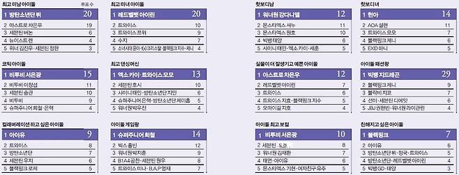 최고 미녀 아이돌 1위는 레드벨벳 아이린이 뽑혔다. 총 20명의 아이돌이 미녀돌 1위로 아이린을 써냈다. 2위는 10표를 받은 트와이스. 특정 멤버 한 명이 아닌 트와이스 그룹을 써낸 아이돌이 10명이나 됐다. 트와이스 멤버 전원이 예쁘다는 의미. 3위는 트와이스 쯔위였다. 9명의 아이돌 가수들이 트와이스 멤버 중에서도 쯔위가 가장 예쁘다고 써냈다. 4위는 '국민 첫사랑' 수지가 차지했다. 소녀시대 윤아, f(x) 크리스탈, 블랙핑크 지수·제니는 공동 5위에 올랐다. 각각 4표씩 받았다.