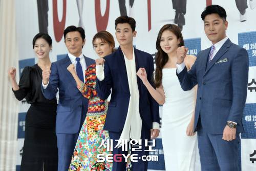 배우 진희경, 장동건, 채정안, 박형식, 고성희, 최귀화(사진 왼쪽부터)가 23일 오후 서울 영등포구 타임스퀘어 아모리스홀에서 열린 새 수목드라마 '슈츠'의 제작발표회에 참석해 포즈를 취하고 있다.