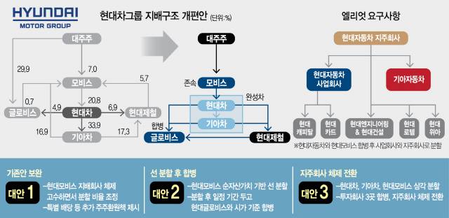 현대자동차그룹 지배구조 개편 작업의 첫 단추였던 현대모비스(012330)와 현대글로비스(086280)의 분할·합병이 전격 취소되면서 현대차(005380)그룹이 재차 출발선으로 돌아왔다. 21일 열린 현대모비스와 현대글로비스 이사회에서는 오는 29일 주주총회를 취소한다고만 했을 뿐 언제까지 지배구조 재편을 재추진하겠다는 논의 자체가 없었다. 막막한 상황에 부닥쳤다는 방증인 셈이다. 그렇다고 무작정 있을 수도 없다. 순환출자 해소라는 과제는 여전히 남아 있다. 더군다나 시장의 반대 기류가 표면적인 이유지만 현대차그룹 스스로 기존 계획을 철회했다. ‘시도해봤지만 안 됐다’는 핑계를 내세우기도 어려운 상황이다. 전문가들은 향후 현대차그룹이 △기존 안 보완 △현대모비스 선 분할 후 현대글로비스와의 합병 △지주회사 체제 전환 등 크게 세 가지 정도의 방안을 모색할 것으로 내다보고 있다.