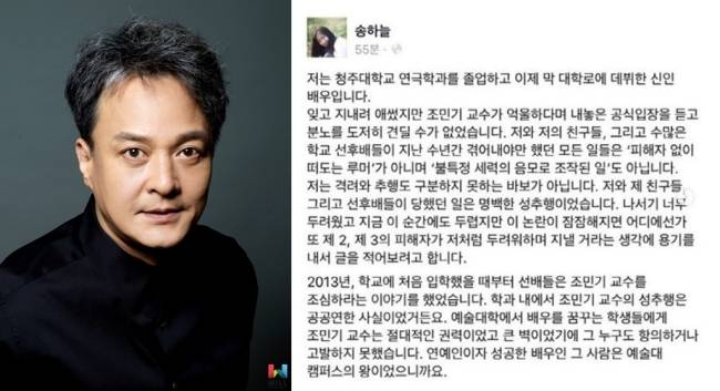 의혹이 제기된 사건에 대한 기억의 노력, 최소한의 성찰은 찾을 수 없다. 반면 ‘바쁜 스케줄에도 불구하고 7년간 교수를 했지만 성추문 음해에 휩싸인 나(조민기)’를 향한 자기연민과 억울함이 돋보인다. 피해자가 누구인지 잠시 헷갈리는 대목이다. 여성을 추행 또는 폭행한 화자의 절절한 고충 토로 서사. 전형적인 노란장판 감성 코드다.