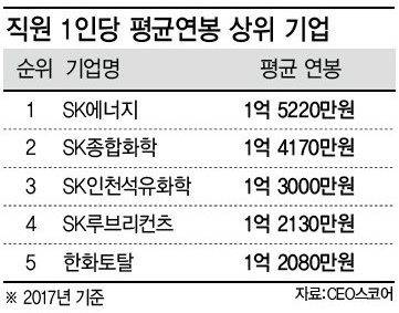 1위는 직원 1인당 평균 연봉이 1억5220만원을 기록한 SK에너지가 차지했다. 평균 연봉은 2016년 대비 1년만에 2060만원이나 올랐다. 이어 SK종합화학(1억4170만원)과 SK인천석유화학(1억3000만원), SK루브리컨츠(1억2130만원)가 2~4위를 기록해 그 뒤를 이었다. SK종합화학(1970만원)과 SK루브리컨츠(1810만원)도 평균 연봉이 2000만원 가까이 상승했다. SK인천석유화학의 평균 연봉도 620만원 올랐다.
