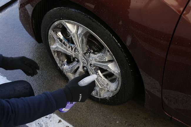 세차 시간 단축을 위해 거품 세정 전 휠크리너를 미리 뿌려 두면 효과적이다. 물을 뿌린 후 철분제거 성분이 포함된 휠크리너를 미리 뿌려 놓고, 외장 청소 후 휠을 닦아내면 타이어 휠에 붙어 있는 각종 오염 물질을 쉽고 빠르게 제거할 수 있다. 이 때 증점 타입의 제품을 사용해야 흐르지 않고 찌든 때를 잘 불려줘 깨끗하게 청소할 수 있다.