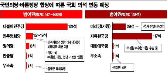 여당인 더불어민주당(121석)의 경우, 정세균 국회의장과 우군으로 분류되는 정의당(6석)ㆍ민중당(1석)을 합해도 129석으로 과반에 못 미친다. 현재 국회 과반 의석(148석)에 19석이나 미달한다.